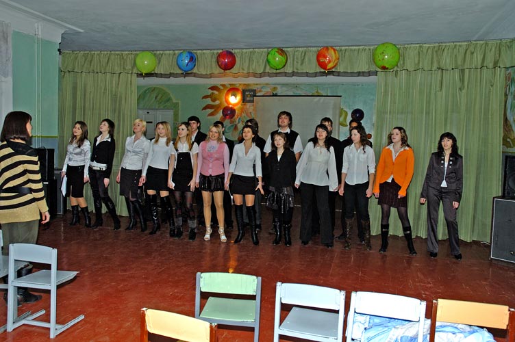 Звучит: "Родная двадцатьтретяя..." Исполняет 11 класс.